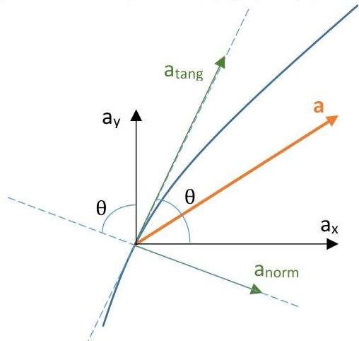 The acceleration vector can be decomposed into x and y components as well as into tangential and normal components (parallel and perpendicular to the tangent to the trajectory of motion). The normal component of the acceleration correlates with the radius of curvature as follows: