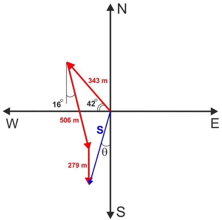 A person is walking in a park. They start at the entrance. They walk 343m 42 degrees north of west, then 506m 16 degrees east of south, and then 279m due south before they go home. What is their displacement?