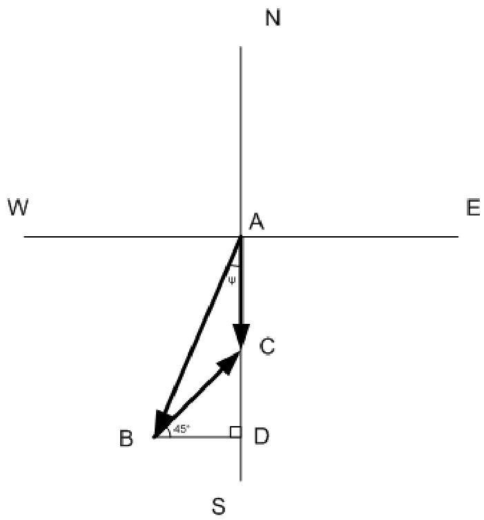 In the additional rectangular triangle BDC the angle CBD equals , because wind blows from southwest.