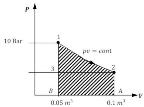 W=shaded area=∫12pdV=∫12Vp1V1dV.W=p1V1lnV1V2=1000⋅0.05⋅ln(0.050.1)=34.7kJ.