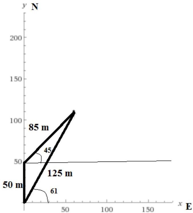 A ship sails 50km due north and then sails 85km , 45 degrees north east. How far the ship from its starting point and what is its exact location? Use the graphical method and analytical method
