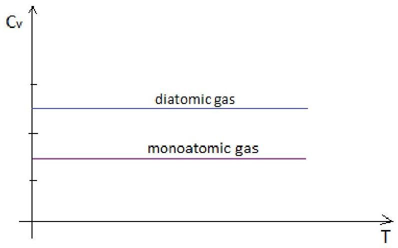 Plot schematic of Cv v/s T curve based for nitrogen and helium gas based on Kinetic theory.