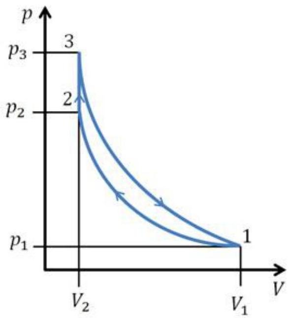 Question. A fluid at 0.7 bar occupying 0.09m3 is compressed reversibly to a pressure of 3.5 bar according to law pVn=constant . The fluid is then heated reversibly at constant volume until the pressure is 4 bar; the specific volume is then 0.05m3/kg . A reversible expansion according to a law pV2=constant restores the fluid to its initial state. Sketch the cycle to a p−V diagram and calculate:
