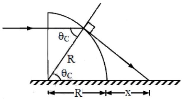 a glass prism in the shape of a quarter-cylinder lies on a horizontal table. a uniform, horizontal light beam falls on its vertical plane surface, as shown in the figure. if the radius of the cylinder is R=5cm and the refractive index of the glass is n=1.5 , where, on the table beyond the cylinder, will a path of light be found?