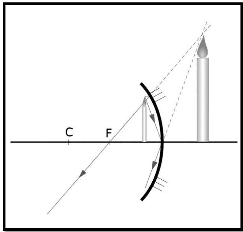 Describe the image of a candle positioned in front of a concave mirror of focal length .