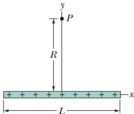 Using the notation λ=q/L we note that the (infinitesimal) charge on an element dx of the rod contains charge dq=λdx . By symmetry, we conclude that all horizontal field components (due to the dq 's) cancel and we need only "sum" (integrate) the vertical components. Symmetry also allows us to integrate these contributions over only half the rod ( 0≤x≤L/2 ) and then simply double the result. In that regard we note that sinθ=R/r where r=x2+R2 .