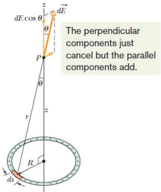 The perpendicular components cancel and we need not consider them further. This leaves the parallel components; they all have the same direction, so the net electric field at P is their sum.