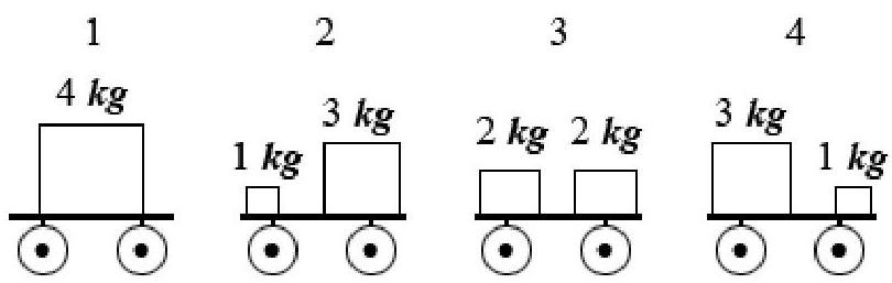 Even though that's wrong I still don't understand why they say that all four carts have the same velocity, shouldn't it be they have all the same weight, and further more if the weight and velocity mean the same thing in this question, then would it matter at all if the question stated that "Forces of the same magnitude directed to the LEFT act on each of the carts for the same length of time.? Would it change anything at all.