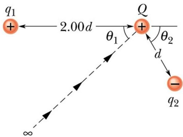 In the figure below, how much work is required to bring the charge Q=+16e and initially at rest, along the dashed line from infinity to the indicated point near two fixed particles of charges q1=+4e and q2=−q1/2 ?