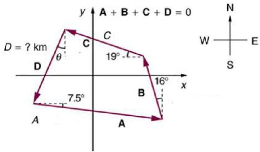 A breeder want to wall off his four-sided plot of flat land. He measures the first three sides, A, B, and C. A=4.75km, B=2.29km, and C=2.9km. What is the length of the vector D in kilometers?