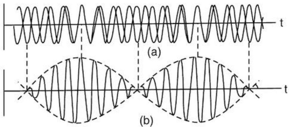 Fig. Beats are formed when two waves of slightly different frequencies combine (a) The individual waves; (b) the resultant wave.