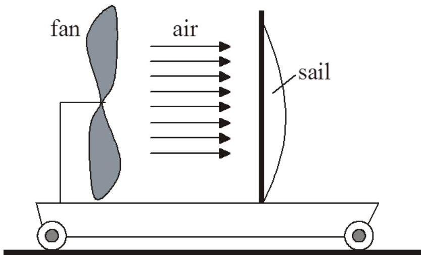 When the fan is turned on an air stream is blown towards the right and is incident on the sail. The cart is free to move with negligible resistance forces.
