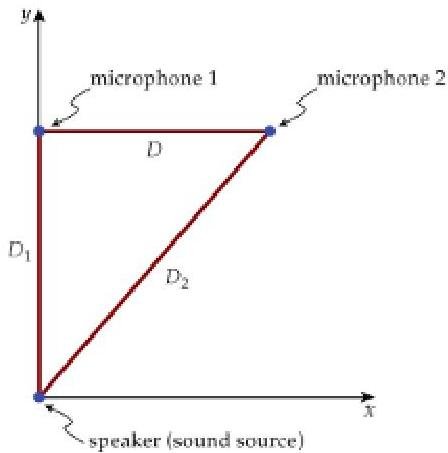 A speaker (sound source) is located at the origin, one pickup microphone is located at distance D1 away and along the positive y-axis and a second pick up microphone is located at a distance d=2.47m to the right of the first microphone at a distance D2 from the speaker. If a sound from the speaker reaches the second microphone 2.54 ms after it reaches the first microphone and the speed of sound is 343 m/s, determine the distances D1 and D2 to the microphone