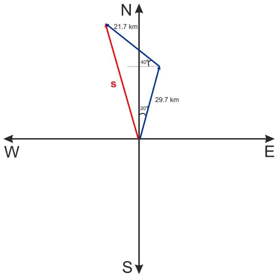 Suppose you first walk 29.7m in a direction 20 degrees east of north and then 21.7m in a direction 40 degrees north of west. How far are you from your starting point, and what is the compass direction of a line connecting your starting point to your final position?