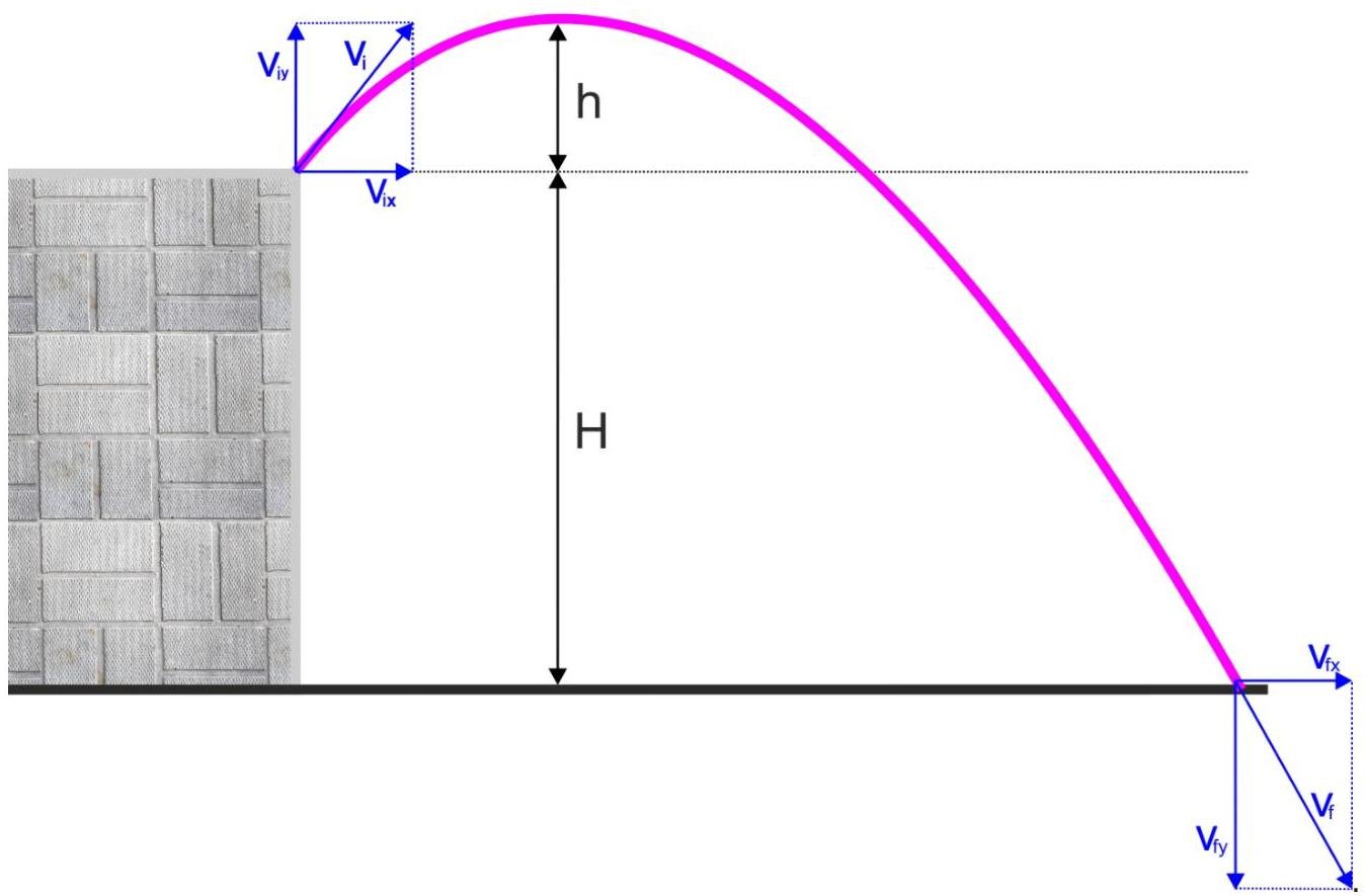 A ball is thrown from the top of the tall building at an unknown angle above the horizontal. The ball attains a maximum height of above the top of the building before striking the ground. If air resistance is neglected, sketch the trajectory of the motion of the ball. Hence, calculate the vertical component of the velocity at the point of projection and the final velocity of the ball at the ground level.