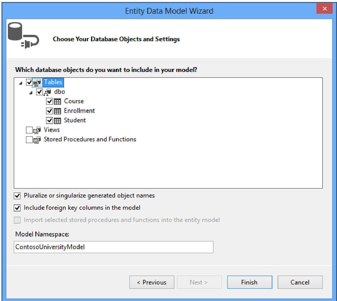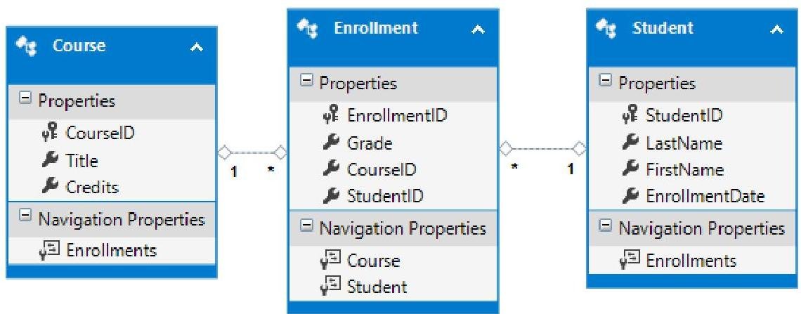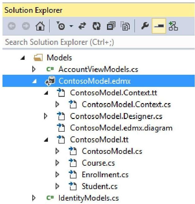 The **ContosoModel.Context.cs** file contains a class that derives from the **DbContext** class, and provides a property for each model class that corresponds to a database table. The **Course.cs**, **Enrollment.cs**, and **Student.cs** files contain the model classes that represent the databases tables. You will use both the context class and the model classes when working with scaffolding.
