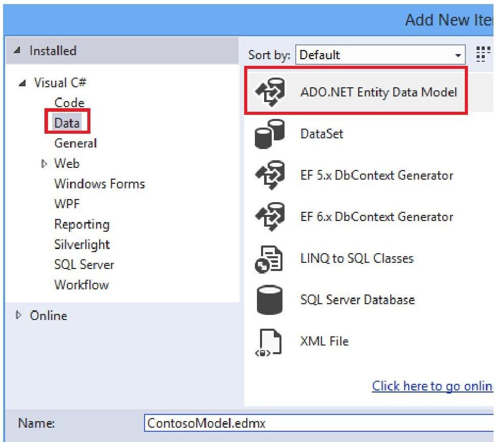 In the Add New Item window, select Data in the left pane and ADO.NET Entity Data Model from the options in the center pane. Name the new model file ContosoModel.edmx.