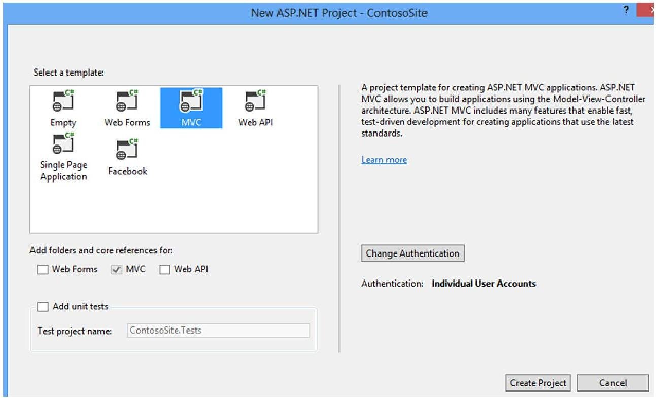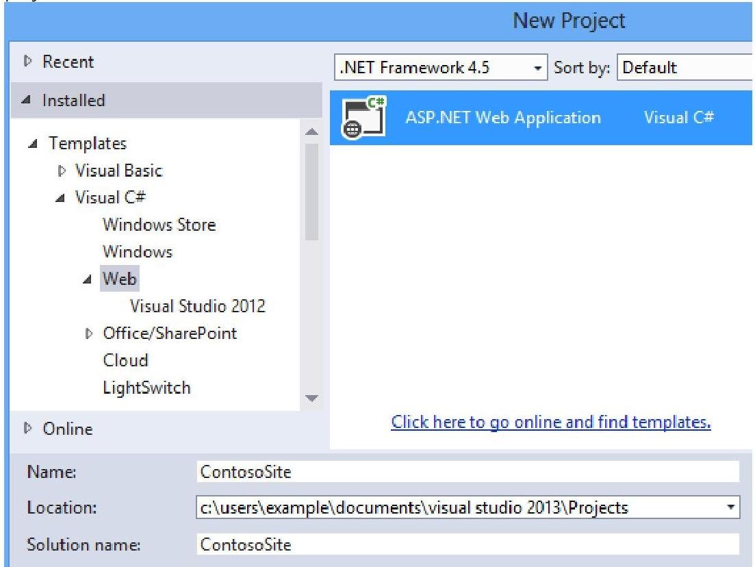 Create a new project in Visual Studio, and select the ASP.NET Web Application template. Name the projectContosoSite.