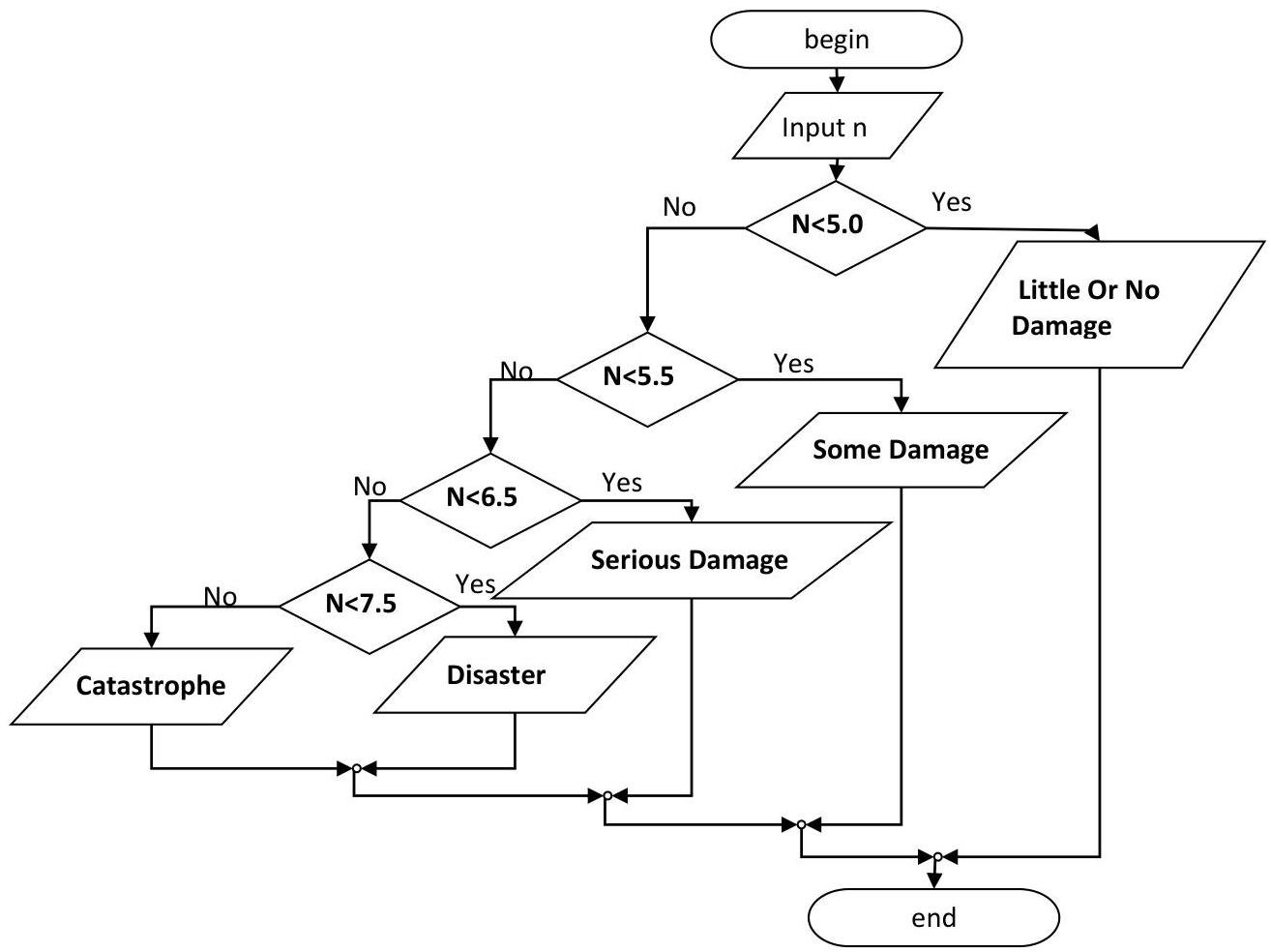 Write the flowchart the national earthquake information center has the following criteria to determine the earthquake's damage. Here are the given richter scale criteria and their corresponding characterization. The richter scale serves as the inoput data and the characterization as output information.