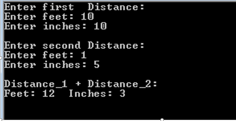 Write a class for Distance which have two parts inches and feet as floating data members. Write an overloaded function for (+) binary operator to add the inches and feet of two distance objects. Main function is also necessary to show the working of the Class.
