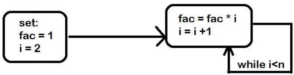 design an algorithm using a flowchart that computes the factorial of integer n n!=n(n(-1)!(n-2)