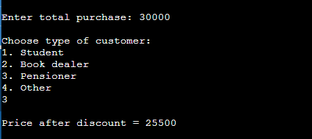 cout<<"\nChoose type of customer:\n1. Student\n2. Book dealer\n3. Pensioner\n4. Other\n";