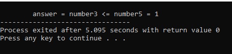 using namespace std; int main() { bool answer ; int number3 = 5, number5 = 30; answer = number3 <= number5 ; cout<<"\n\tanswer = number3 <= number5 = "<<answer; return(0); }