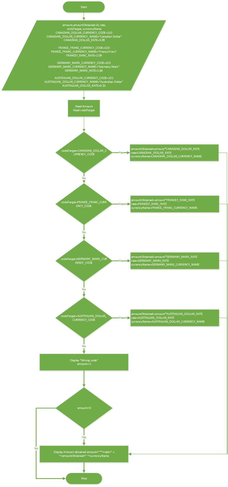 Given the Table 1 below that shows the Malaysia Ringgit currency exchange rate at Bank A. Draw the flowchart to design the logical flow for currency rate calculator. User needs to key-in the amount of Ringgit Malaysia he/she has and choose currency code target. Your currency rate calculator needs to calculate the amount obtained after the conversion according to the rate shows in Table 1 and display it to the user.