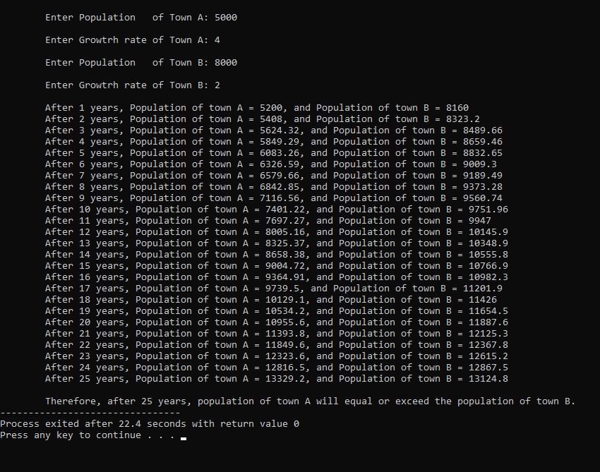cout<<"\n\tAfter "<<n<<" years, Population of town A = "<<Pa<<", and Population of town B = "<<Pb;