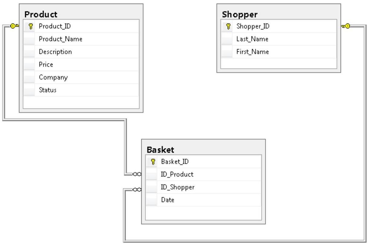 SELECT pr.Product_ID,bas.Basket_ID,pr.Product_Name,pr.Description,sh.First_Name FROM Product AS pr,Basket AS bas, Shopper As shSecond: