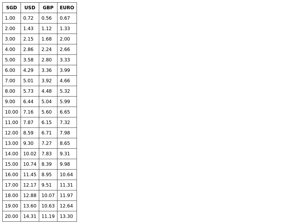 fprintf('SGD \t USD \t GBP \t EURO\n');