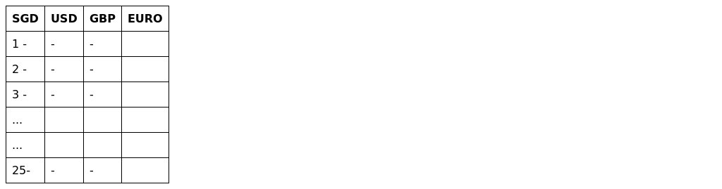 Write a matlab script to display currency conversion for US dollar, british pound, euro with singapore dollar as the base currency. your output should show the equivalent values for USD, GBP, EURO for ever singapore dollar in increments of 1 dollar until 25 dollars.