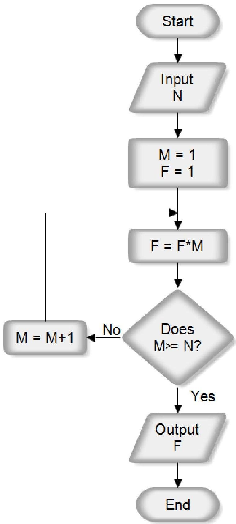 BEGIN - read (N) - F = 1 - M = 1 Label1: - F = F * M - if M >= N - write (F) - else - M = M + 1 - goto Label1 END