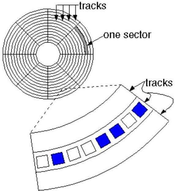 Tracks are further divided into sectors, which hold a block of data that is read or written at one time; for example, READ SECTOR 782, WRITE SECTOR 5448. In order to update the disk, one or more sectors are read into the computer, changed and written back to disk. The operating system figures out how to fit data into these fixed spaces.