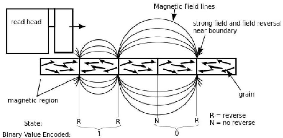 The most common forms of permanent data storage used in modern computers – hard disks and archival tapes – represent data as magnetized “bars” on the surface of a thin medium, where writing and reading of data requires mechanical movement of the medium.