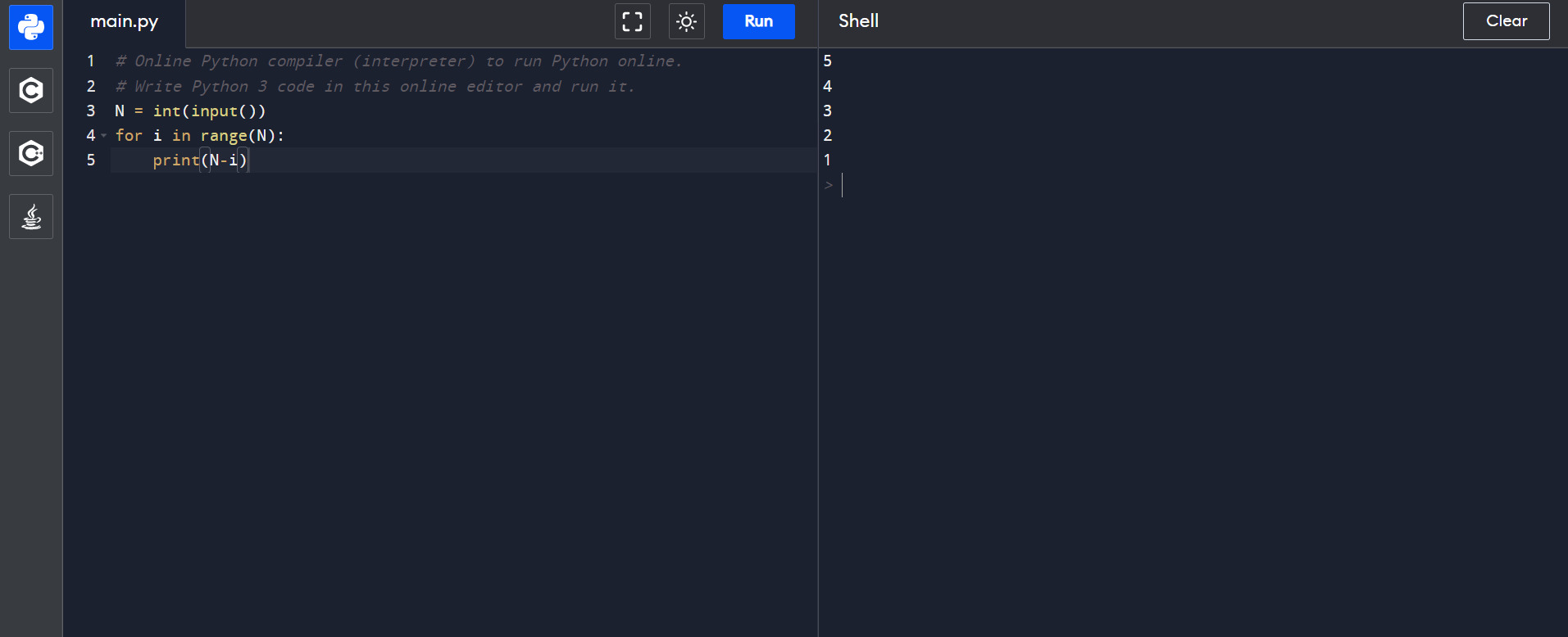 N = 5 the integers from 5 to 1 are 5, 4, 3, 2, 1.