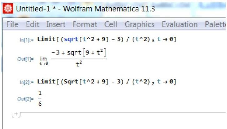 Limit[(sqrt[t^2 + 9] - 3)/(t^2), t -> 0]