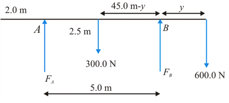 ∑τB=(FA)(7.0m)+(600N)(y)−(300N)(4.50m−y)