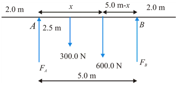 ∑τB=FA(5.0m)−(300N)(2.50m)−(600N)(5.0m−x)0=5FA−750N⋅m−3000N⋅m+600x5FA=3750N⋅m−600xFA=750N⋅m−120x